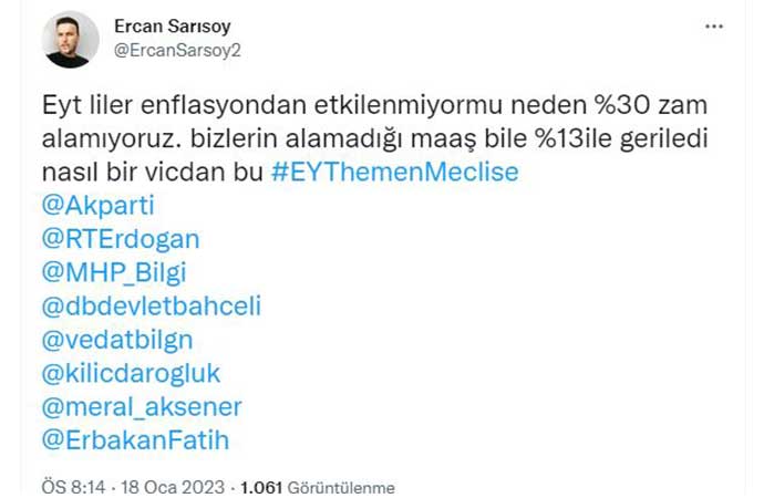 Sosyal medyada “EYT Hemen Meclise” etiketine paylaşım yapan EYT’liler hükumete tepki gösteren çok sayıda mesaj attılar ve sosyal medyada Türkiye gündemine girdiler.