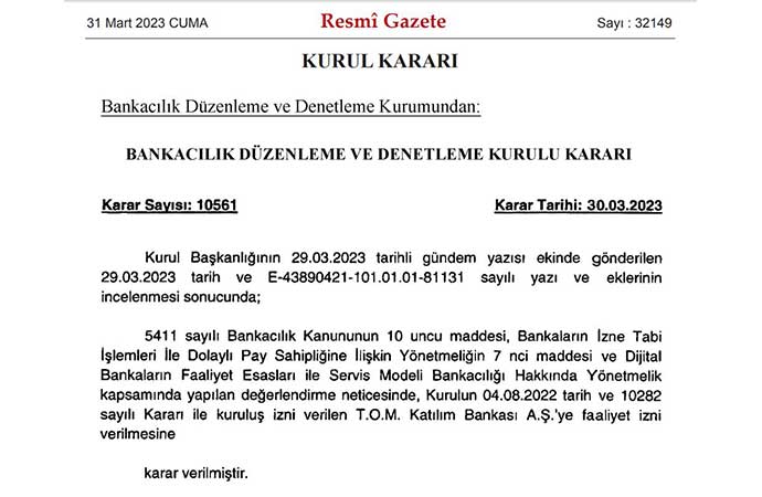 Konuyla ilgili Resmi Gazete’de yayınlanan kararda, “5411 sayılı Bankacılık Kanununun 10 uncu maddesi,Bankaların İzne Tabi İşlemleri ile Dolaylı Pay Sahipliğine İlişkin Yönetmeliğin 7 nci maddesi ve Dijital Bankaların Faaliyet Esasları ile Servis Modeli Bankacılığı Hakkında Yönetmelik kapsamında yapılan değerlendirme neticesinde, Kurulun 04.08.2022 tarih ve 10282 sayılı Kararı ile kuruluş izni verilen T.O.M Katılım Bankası A.Ş.’ye faaliyet izni verilmesine karar verilmiştir” ifadelerine yer verildi.