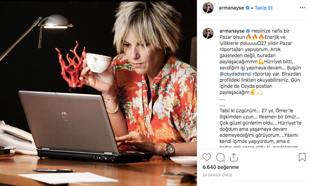 Hürriyet gazetesi yazarı Ayşe Arman, istifasını noter yoluyla gazete yönetimine gönderdiğini sosyal medya hesabı üzerinden duyurdu.