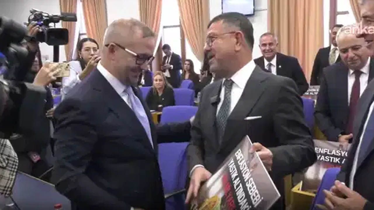 Toplantı başlamadan önce CHP grubu, TCMB'nin enflasyon ve faiz politikalarını protesto etti. CHP sıralarında milletvekilleri, "Enflasyonun sebebi yastık altındaki 500 milyar dolar" yazılı dövizler yer aldı.