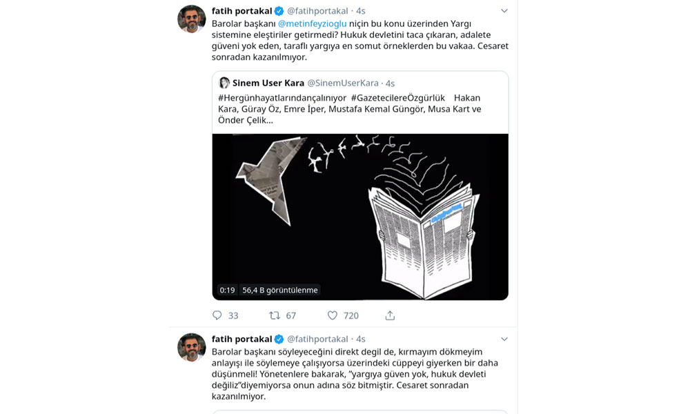 Yargıtay Başkanlığı tarafından düzenlenen 2019-2020 Adli Yıl Açılış Töreni tartışmalar altında bugün Cumhurbaşkanlığı Sarayı’nda yapıldı. TBB Başkanı Metin Feyzioğlu baroların protesto ettiği törende konuştu. https://tele1.com.tr/can-atakli-erdogan-yargida-yargilananlara-hain-diyor-iste-cadir-devleti-bu-80909/ Feyzioğlu'na bir eleştiri de gazeteci Fatih Portakal'dan geldi. Portakal, Feyzioğlu'nun sözlerini suya sabuna dokunmamakla eleştirdi. Fatih Portakal, "Barolar başkanı söyleyeceğini direkt degil de, kırmayım dökmeyim anlayışı ile söylemeye çalışıyorsa üzerindeki cüppeyi giyerken bir daha düşünmeli! Yönetenlere bakarak, ”yargıya güven yok, hukuk devleti değiliz”diyemiyorsa onun adına söz bitmiştir. Cesaret sonradan kazanılmiyor. Barolar başkanı @metinfeyzioglu niçin bu konu üzerinden Yargı sistemine eleştiriler getirmedi? Hukuk devletini taca çıkaran, adalete güveni yok eden, taraflı yargıya en somut örneklerden bu vakaa. Cesaret sonradan kazanılmıyor." tweetlerini paylaştı. Barolar başkanı söyleyeceğini direkt değil de, kırmayım dökmeyim anlayışı ile söylemeye çalışıyorsa üzerindeki cüppeyi giyerken bir daha düşünmeli! Yönetenlere bakarak, ”yargıya güven yok, hukuk devleti değiliz”diyemiyorsa onun adına söz bitmiştir. Cesaret sonradan kazanılmiyor.