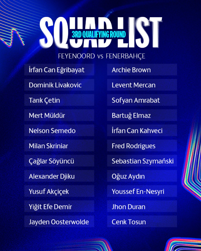 Fenerbahçe, Şampiyonlar Ligi 3. Ön Eleme Turu'nda yarın akşam Feyenoord ile mücadele edeceği karşılaşmanın kadrosunu açıkladı.