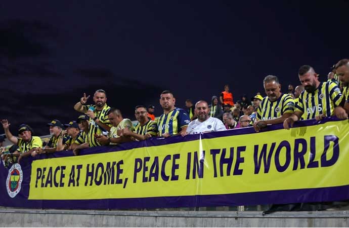Fenerbahçeli taraftarlar, tribünlerde Türkiye Cumhuriyeti Kurucu Cumhurbaşkanı Mustafa Kemal Atatürk'ün sözünün yazılı olduğu pankart açtı. Pankartta Mustafa Kemal Atatürk'ün "Yurtta sulh cihanda sulh" sözünün İngilizcesi olan "Peace at home, peace at world" ifadeleri yer aldı. https://tele1.com.tr/fenerbahce-ve-trabzonspora-uefadan-ceza-717427/