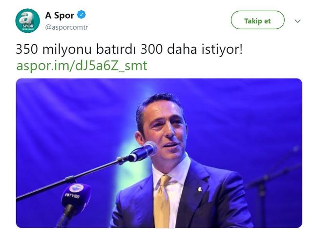 Fenerbahçe Kulübü, a spor'un “350 milyonu batırdı, 300 daha istiyor” haberi üzerine resmi siteden bir açıklama yaptı. Çalık Holding'e ait a spor kanalı hükümete yakınlığıyla biliniyor. Erdoğan'ın damadı Enerji ve Tabii Kaynaklar Bakanı Berat Aybayrak da bir dönem Çalık Enerji'de CEO olarak çalışmıştı.