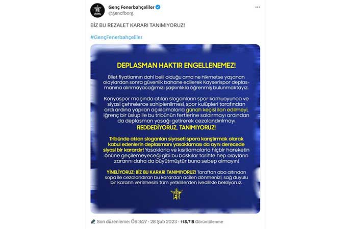 “DEPLASMAN HAKTIR..! Tribünler taraftarlarındır. Hiç bir gerekçe gösterilmeden Fenerbahçe kulübüne getirilen deplasman yasağının sebebinin takipçisiyiz.Her olumsuz koşulda ülkenin yükünü omuzlayan taraftarları,sevdasından ayırmaya kimsenin gücü yetmez..!”