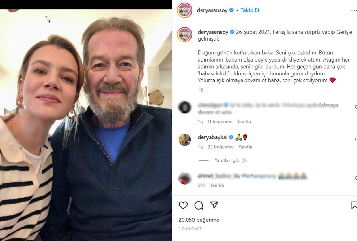 Ferhan Şensoy'un Derya Baykal ile evliliğinden dünyaya gelen kızı Derya Şensoy da babasını doğum gününde andı. Babasıyla çekilen eski bir fotoğrafını paylaşan Şensoy, duygusal bir mesaj kaleme aldı. Derya Şensoy, gönderisinde, "26 Şubat 2021... 'Feruş’la sana sürpriz yapıp, Geriş’e gelmiştik. Doğum günün kutlu olsun baba. Seni çok özledim. Bütün adımlarımı, 'Babam olsa böyle yapardı’ diyerek attım. Attığım her adımın arkasında, senin gibi durdum. Her geçen gün daha çok ‘babası kılıklı’ oldum. İçten içe bununla gurur duydum. Yoluma ışık olmaya devam et baba, seni çok seviyorum" ifadelerini not düştü.