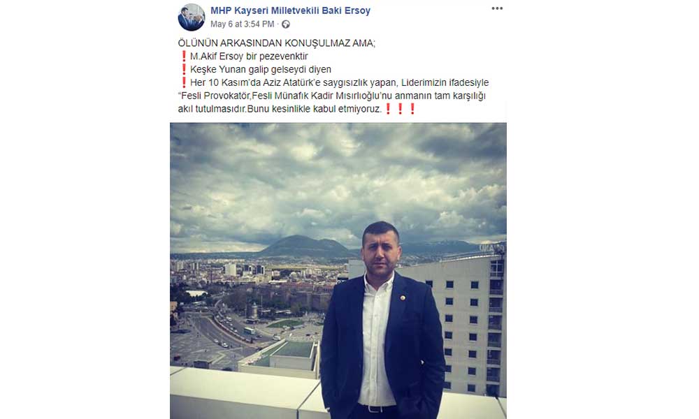 Kayseri'nin AKP'li Melikgazi Belediye Başkanı Mustafa Palancıoğlu'nun, Türkiye ve Mustafa Kemal Atatürk'le ilgisi sarf ettiği sözlerle gündeme gelen Kadir Mısıroğlu'na 'üstad' paylaşımı yapmasına, MHP Kayseri Milletvekili Baki Ersoy, "Mehmet Akif Ersoy'a bir pezevenk diyen fesli provokatörü anmak akıl tutulmasıdır" ifadeleri kullandı.