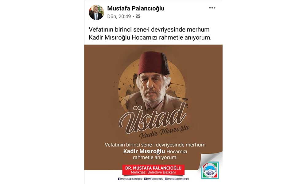 Kayseri’nin AKP’li Melikgazi Belediye Başkanı Mustafa Palancıoğlu, Atatürk ve Cumhuriyet’e yönelik hakaretleri ile gündeme gelen Kadir Mısıroğlu’nu ölüm yıl dönümününde sosyal medya hesabından yaptığı 'üstad' paylaşımı ile andı.