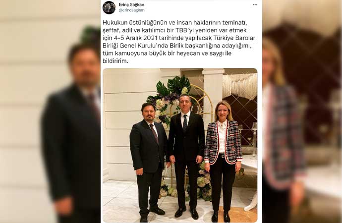 Erinç Sağkan, Twitter hesabından yaptığı paylaşımla adaylığını duyurdu. Sağkan adaylığını Bursa Baro Başkanı Gürkan Altun ve Kocaeli Baro Başkanı Bahar Gültekin Candan'la birlikte fotoğraf paylaşarak duyurması dikkatlerden kaçmadı. Sağkan adaylığını "Hukukun üstünlüğünün ve insan haklarının teminatı, şeffaf, adil ve katılımcı bir TBB’yi yeniden var etmek için 4-5 Aralık 2021 tarihinde yapılacak Türkiye Barolar Birliği Genel Kurulu’nda Birlik başkanlığına adaylığımı, tüm kamuoyuna büyük bir heyecan ve saygı ile bildiririm" ifadeleri ile duyurmuş oldu.