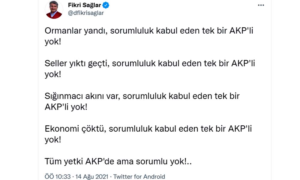 CHP eski milletvekili eski Kültür Bakanı Fikri Sağlar, ülkede son dönemde yaşanan felaketlerde AKP iktidarının sorumluluk almamasına tepki gösterdi.