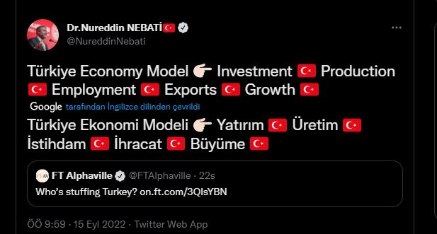 Kendisine ait resmi sosyal medyadan Financial Times'ın analizlerinin bulunduğu habere cevap veren Hazine ve Maliye Bakanı Nureddin Nebati İngilizce olarak "Türkiye Economy Model - Investment - Production - Employment - Exports - Growth " (Türkiye Ekonomi Modeli Yatırım- Üretim - İstihdam - İhracat - Büyüme) ifadelerini kullandı..