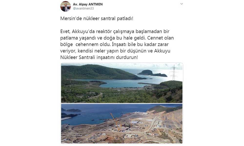 Cumhuriyet Halk Partisi Mersin Milletvekili Alpay Antmen, Akkuyu Nükleer Santrali inşaatından paylaştığı bir fotoğraf ile "Mersin'de nükleer santral patladı" doğanın katledildiği binlerce ağacın kesildiğini gözler önüne serdi.