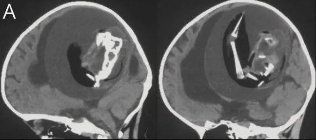 Bebeğin kafatasını çeşitli görüntüleme yöntemleriyle inceleyen araştırmacılar, beyninin sıkıştığını ve sıvı birikimi oluştuğunu tespit etti.