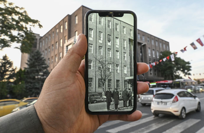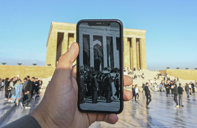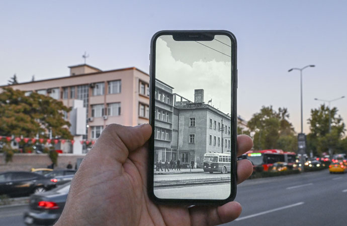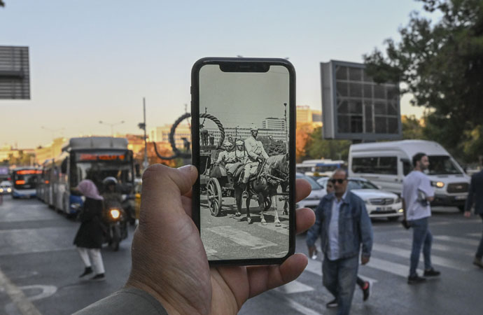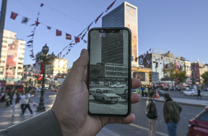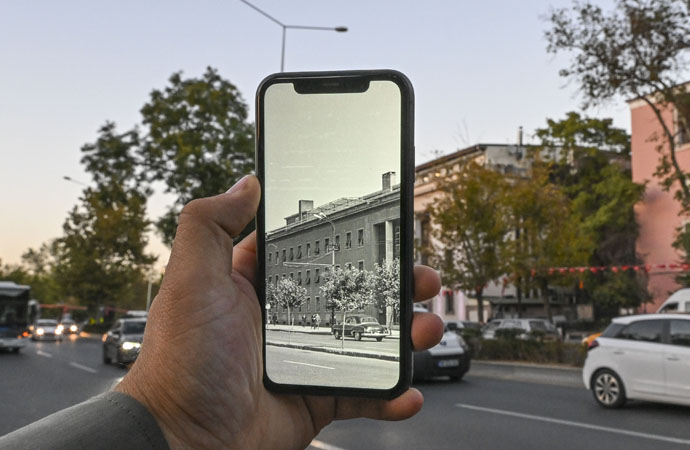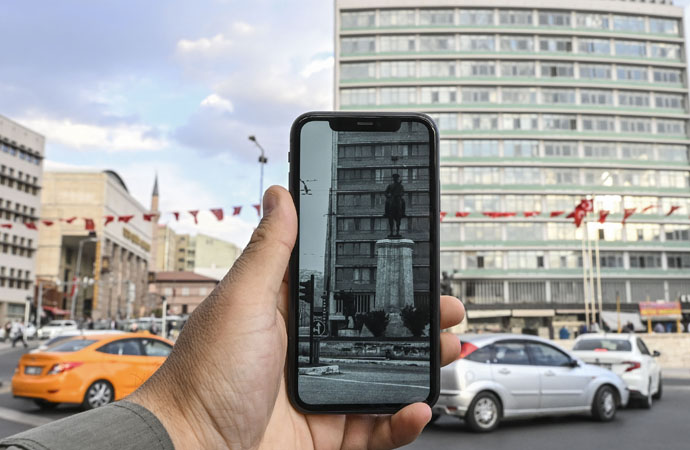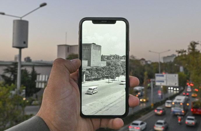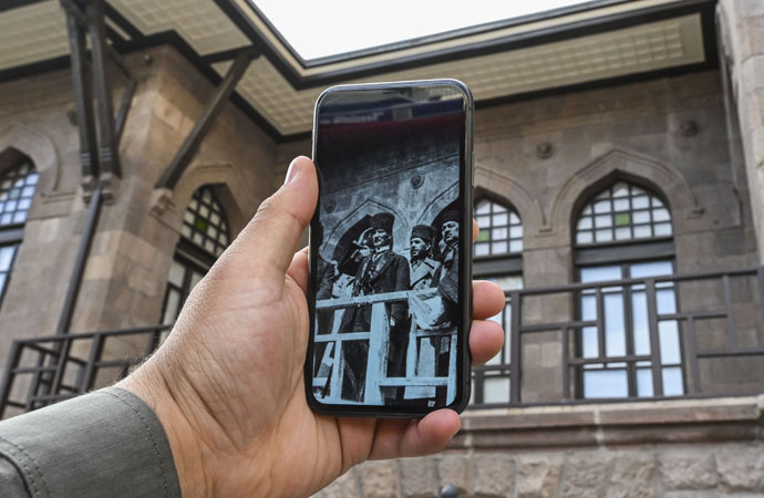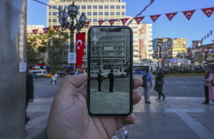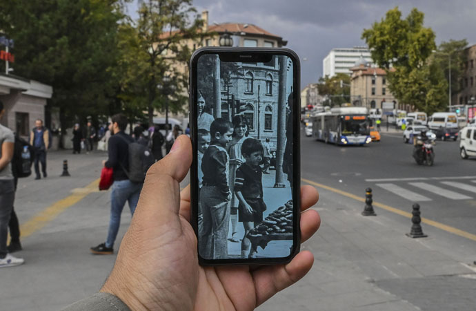 Anadolu Ajansı (AA) tarafından yapılan çalışmada, cep telefonu ekranına bir bölümü yansıtılan siyah-beyaz fotoğraflar, aynı açıdan geniş bir kadraj içerisinde yeniden çekildi.