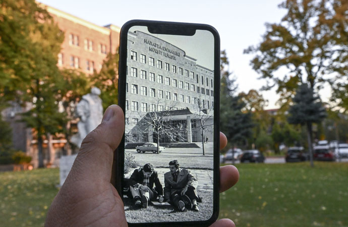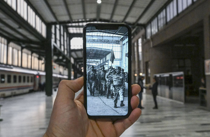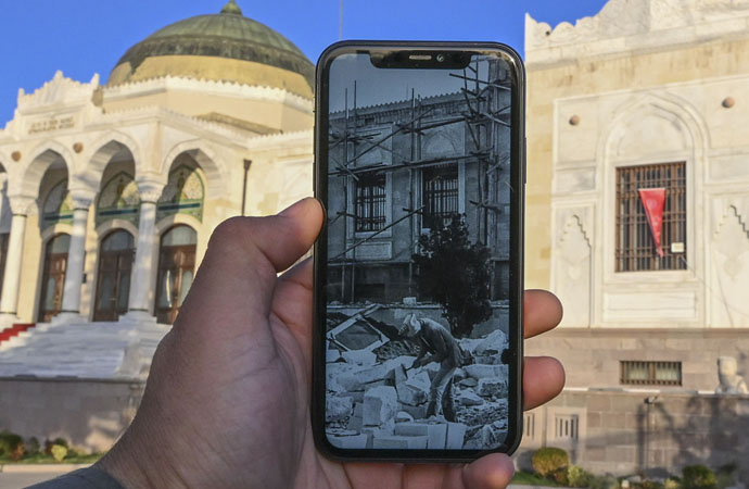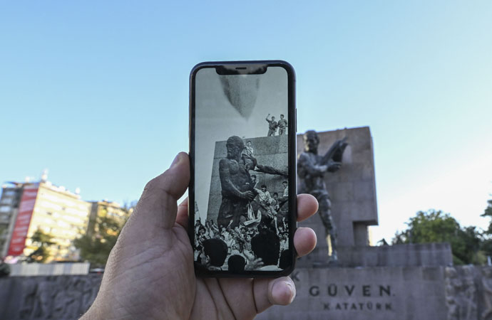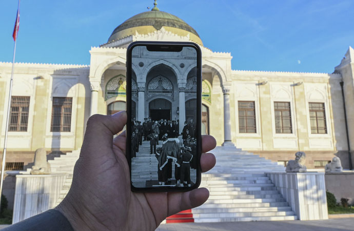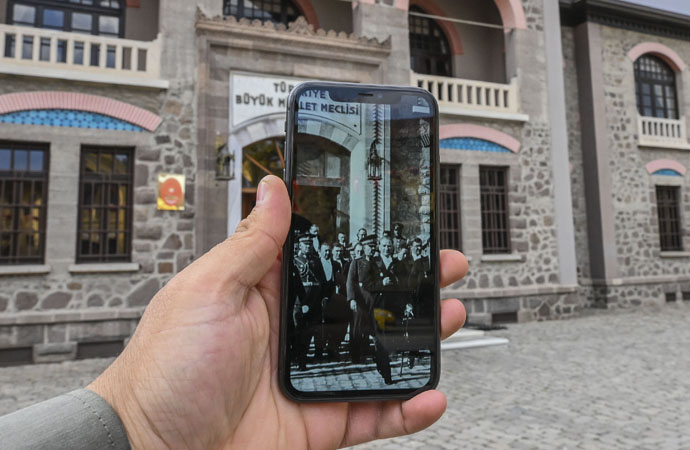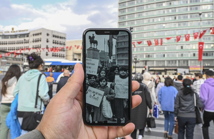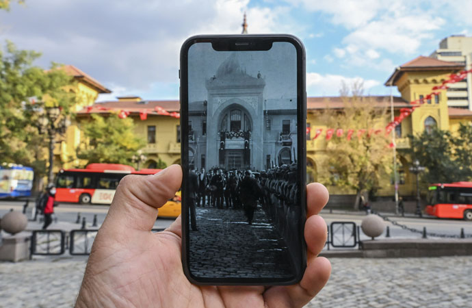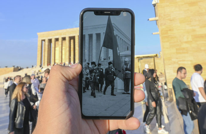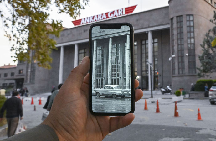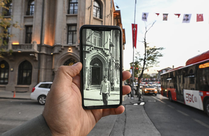 Anadolu Ajansı (AA) tarafından yapılan çalışmada, cep telefonu ekranına bir bölümü yansıtılan siyah-beyaz fotoğraflar, aynı açıdan geniş bir kadraj içerisinde yeniden çekildi.