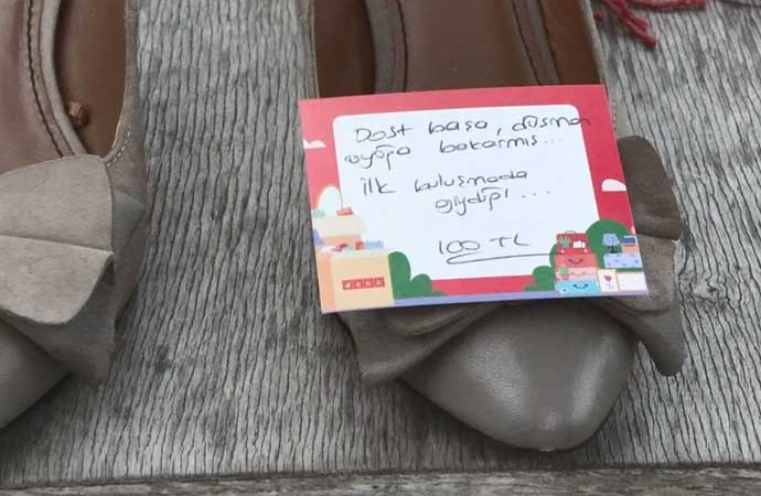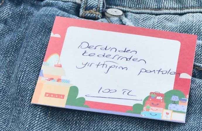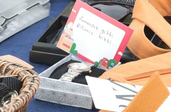 Tezgahlarda kıyafetten, kitaba, saatten, kupaya birçok ürün yer aldı. Ürünlerin üzerindeki notlar da ayrıca dikkat çekti.