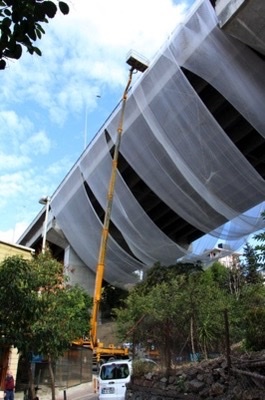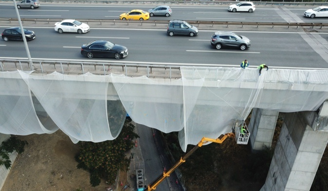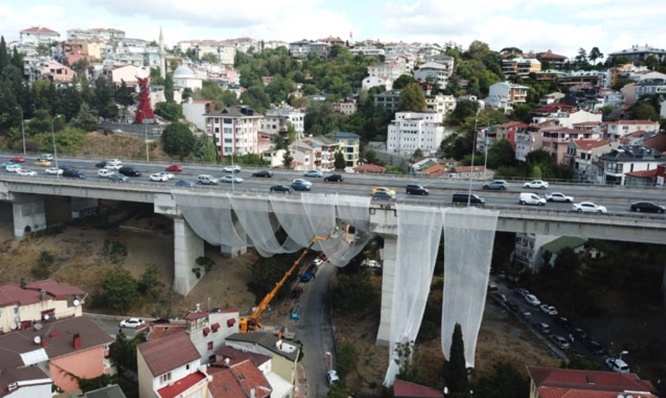 Karayolları Genel Müdürlüğü ekipleri, viyadüğün altına file çekerek geçici önlem aldı. Viyadük altına file germe çalışmaları havadan da görüntülendi.