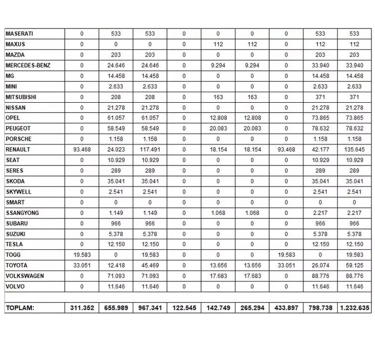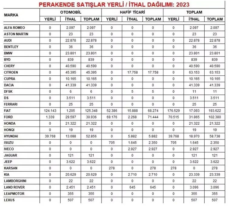 İşte 2023 yılına ilişkin otomobil markalarının satış rakamları listesi...