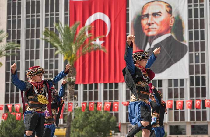İzmir'de çocuklar efe kostümleri giyerek harmandalı oyunu oynadı.