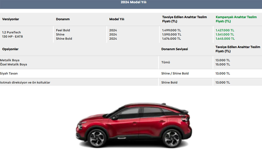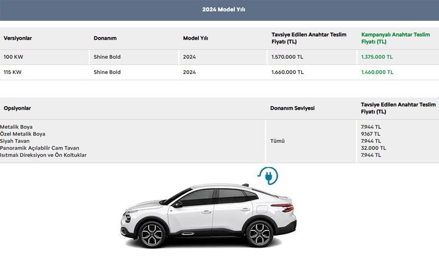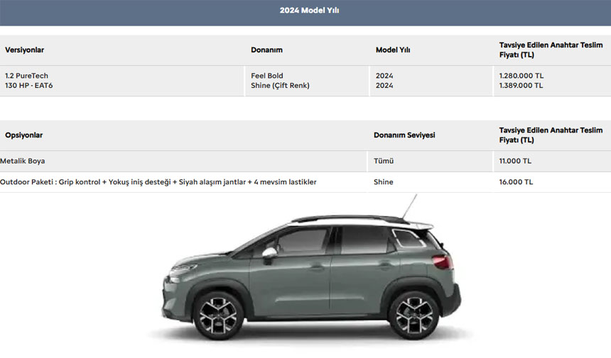 Yukarıda yer alan tüm fiyatlar Stellantis Otomotiv Pazarlama A.Ş.tarafından tavsiye edilen fiyatlardır ve 31/10/2024 tarihine kadar geçerlidir. Bu fiyatlar bilgi için olup satın alma anındaki fiyatlar geçerlidir. Trafik sigorta bedeli fiyata dahil değildir. Kampanyalar stoklarla sınırlıdır. Stellantis Otomotiv Pazarlama A.Ş. ön bildirimde bulunmaksızın araçların fiyat ve özelliklerinde değişiklik yapma hakkını saklı tutar. Araçların fiyat ve özellikleri hakkında daha fazla bilgi için bir Citroen yetkili satıcısına danışınız."