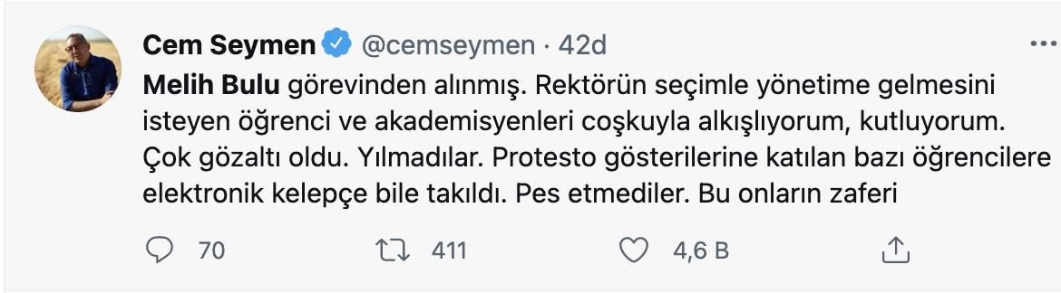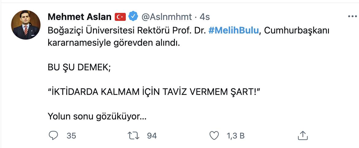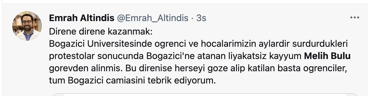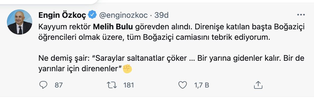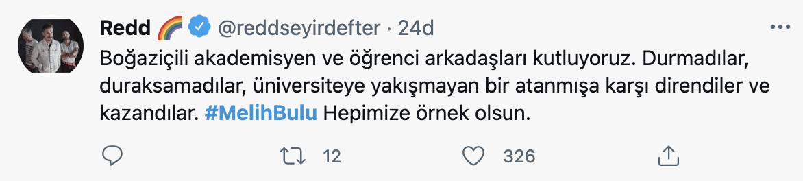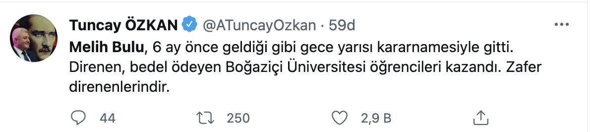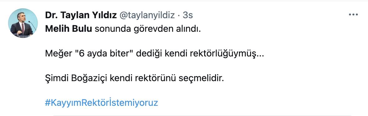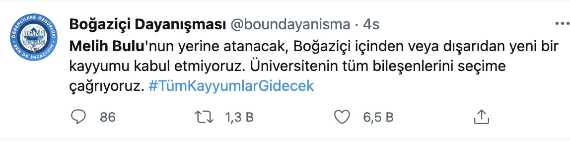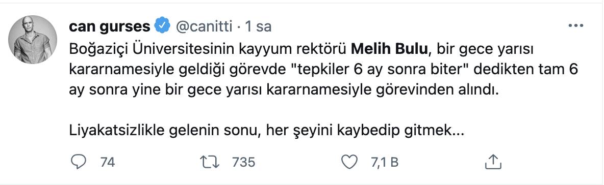 7 ay önce Boğaziçi Üniversitesi Rektörlüğü'ne atanan Prof. Dr. Melih Bulu'nun görevden alınması sosyal medyada en çok tartışılan konu haline geldi. Bulu'nun görevden alınmasına yönelik sosyal medyada sevinçle karşılandı. Konuyla ilgili paylaşımlarda Boğaziçililer'in direnişine dikkat çekildi: