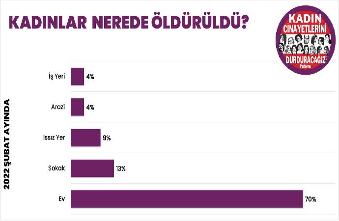 "Kadınların 16’sı evinde, 3’ü sokak ortasında, 2’si ıssız yerde, 1’i iş yerinde ve 1’i ise arazide "öldürülmüştür. Bu ay öldürülen kadınların yüzde 70’i evlerinde öldürüldü.