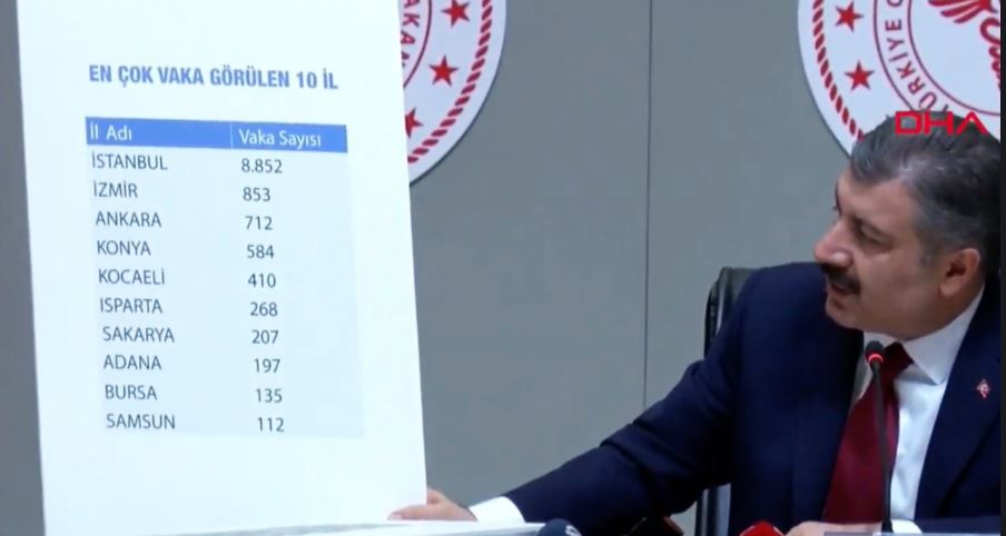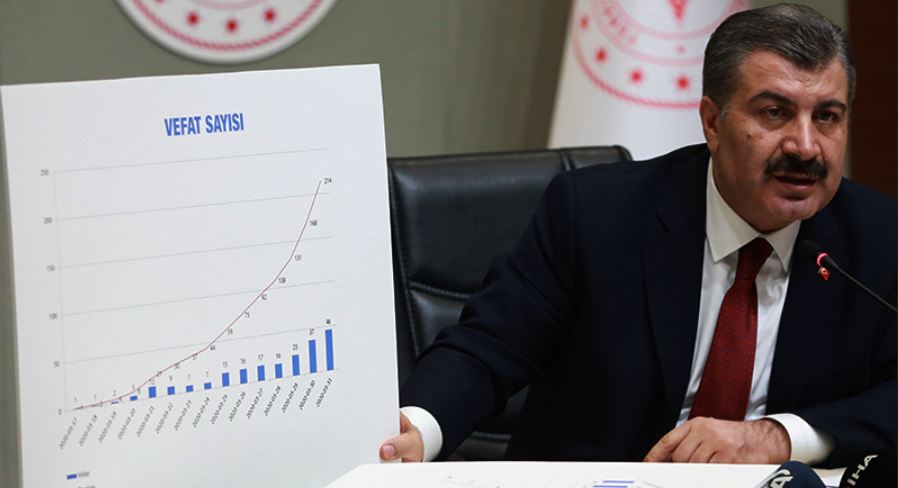 Sağlık Bakanı Fahrettin Koca, Türkiye’de koronavirüs kaynaklı ölüm sayısının 277'ye, toplam vaka sayısının da 15 bin 679’a yükseldiğini bildirdi. Koronavirüsün 81 ile yayıldığını açıklayan Koca, İstanbul’un 8 bin 882 vaka ile virüsün en çok görüldüğü şehir olduğunu belirtti.