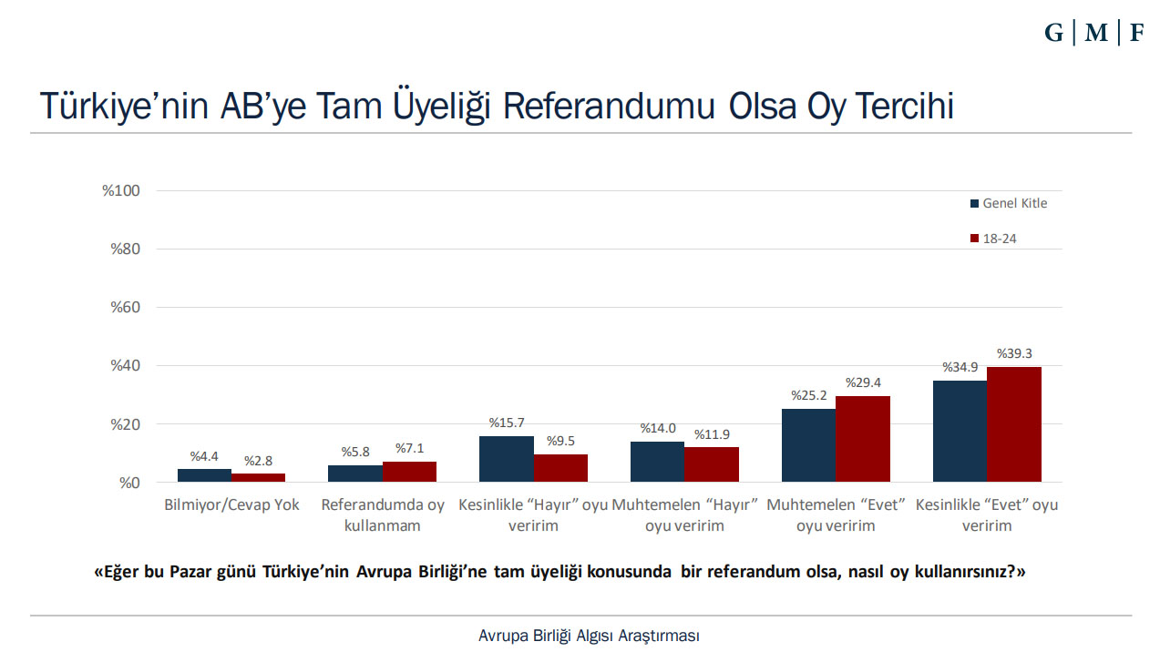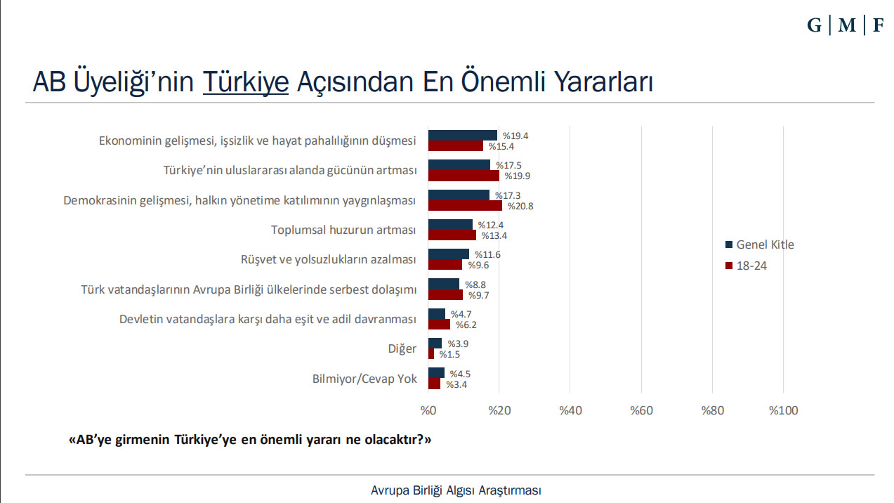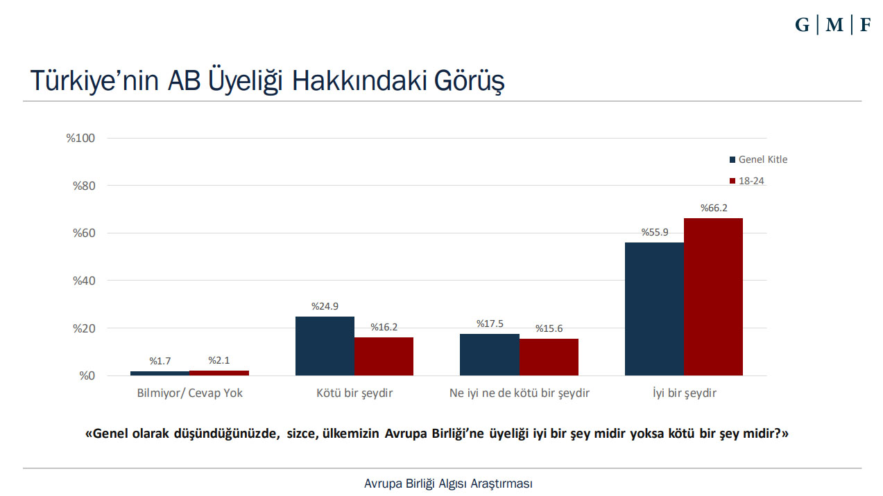 Türkiye’nin AB üyeliği hakkında görüş bildiren katılımcıların yüzde 55,9'u AB üyeliğinin iyi olduğunu belirtirken bu oran 18-24 yaş arası gençlerde yüzde 66,2 olarak ölçüldü.