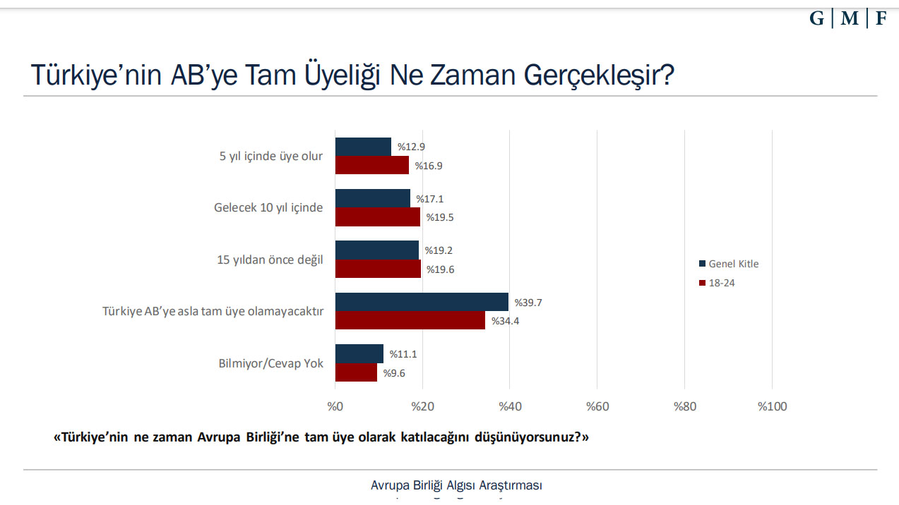 Araştıramaya katılan katılımcılar her ne kadar AB üyeliğini desteklese de Türkiye'nin AB üyeliğinin gerçekleşmesine ihtimal vermiyor. Araştıramya katılanların yüzde 39.7'si "Türkiye AB’ye asla tam üye olamayacaktır" derken bu oran 18-24 yaş arası gençlerde yüzde 34,4 olarak belirlendi.