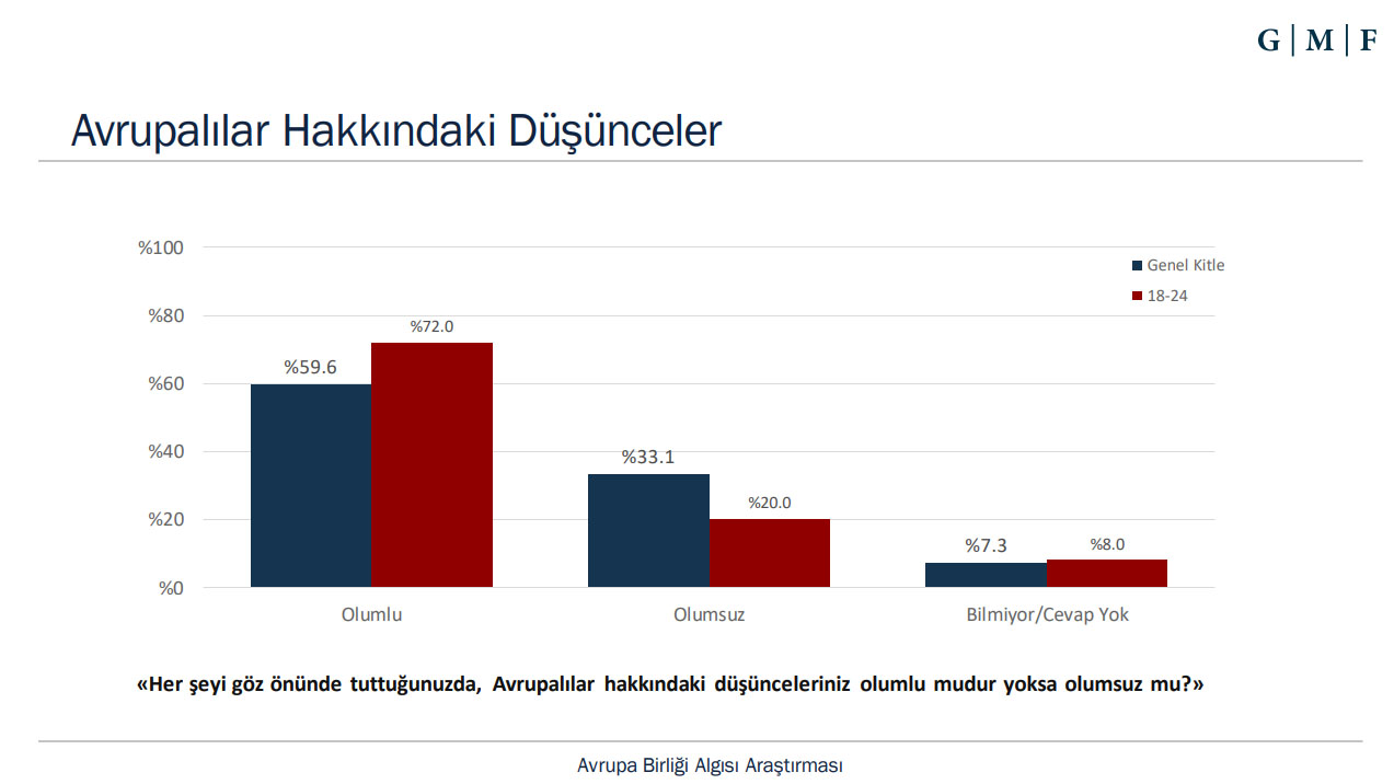 "Avrupalılar hakkındaki düşünceleriniz olumlu mudur yoksa olumsuz mu?" sorusuna yanıt veren katılımcıların yüzde 59,6'sı olumlu derken yüzde 33,1'i olumsuz dedi. Bu oranlar 18-24 yaş arası gençlerde olumlu yanıtı içinyüzde 72,0 olarak ölçülürken olumsuz yanıtı için ise yüzde 20 olarak belirlendi.