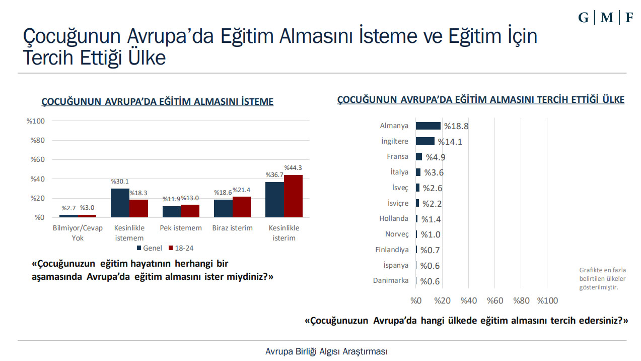 "Çocuğunuzun Avrupa’da hangi ülkede eğitim almasını tercih edersiniz?" sorusuna yanıt veren katılımcılar yüzde 18,8'le Almanya yanıtını verirken Almanyayı yüzde 14,1 ile İngiltere, yüzde 4,9'la Fransa izledi