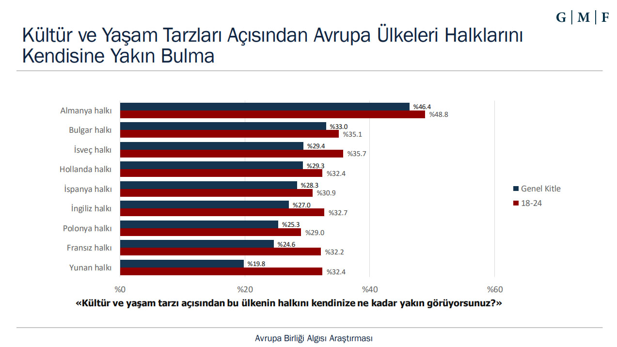 "Kültür ve yaşam tarzı açısından bu ülkenin halkını kendinize ne kadar yakın görüyorsunuz?" sorusunu yanıtlayan katılımcılar yüzde 46,4 ile Almanyayı kendilerine yakın buldukalrını belirttiler.