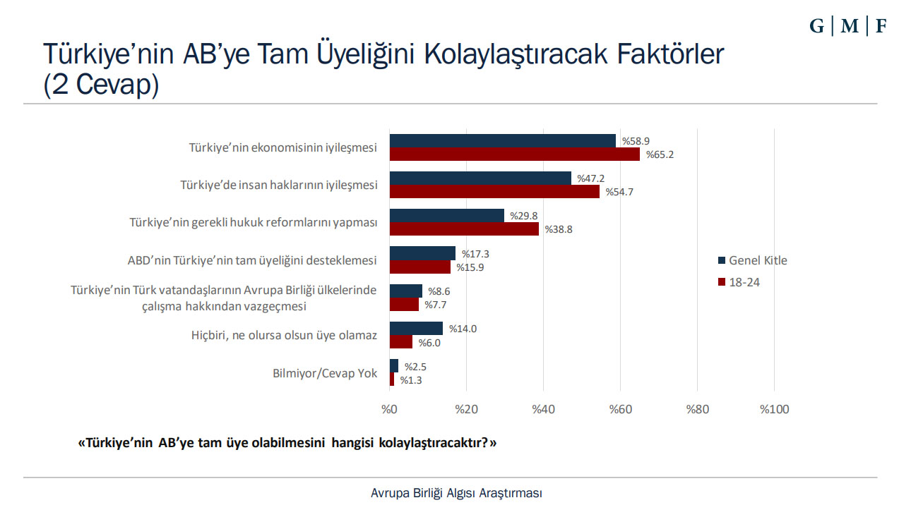 "Türkiye’nin AB’ye tam üye olabilmesini hangisi kolaylaştıracaktır?" sorusunu yanıtlayan katılımcıların yüzde 58,9 ekonomik iyileştirmelerden bahsederken yüzde 47,2'si insan haklarının iyieştirilmesi gerektiğini savundu.