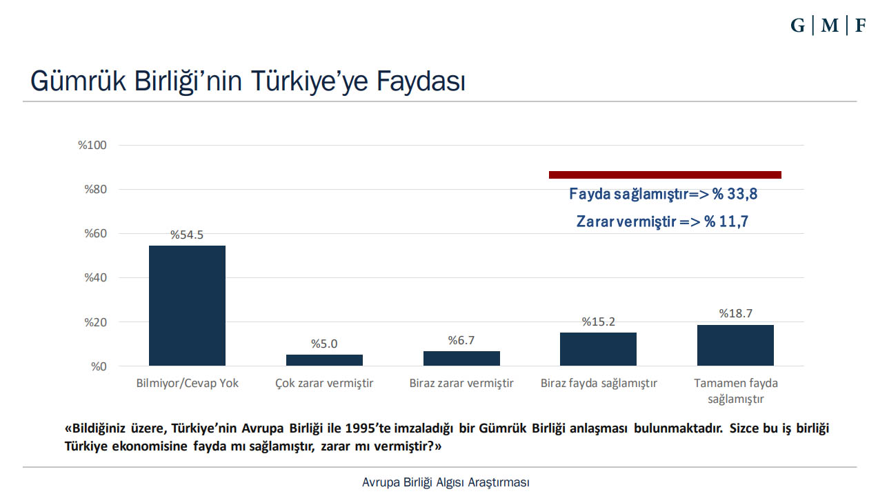 Türkiye ekonomisine fayda mı sağlamıştır, zarar mı vermiştir?" sorsuna yanıt veren katılımcıların yüzde 54,5'i Gümrük Birliği ile ilgili bir değerlendirme yapamazken fayda sağladı diyenlerin oranı yüzde 33,8, fayda sağlamadı diyenlerin oranı ise 11,7 olarak belirlendi.