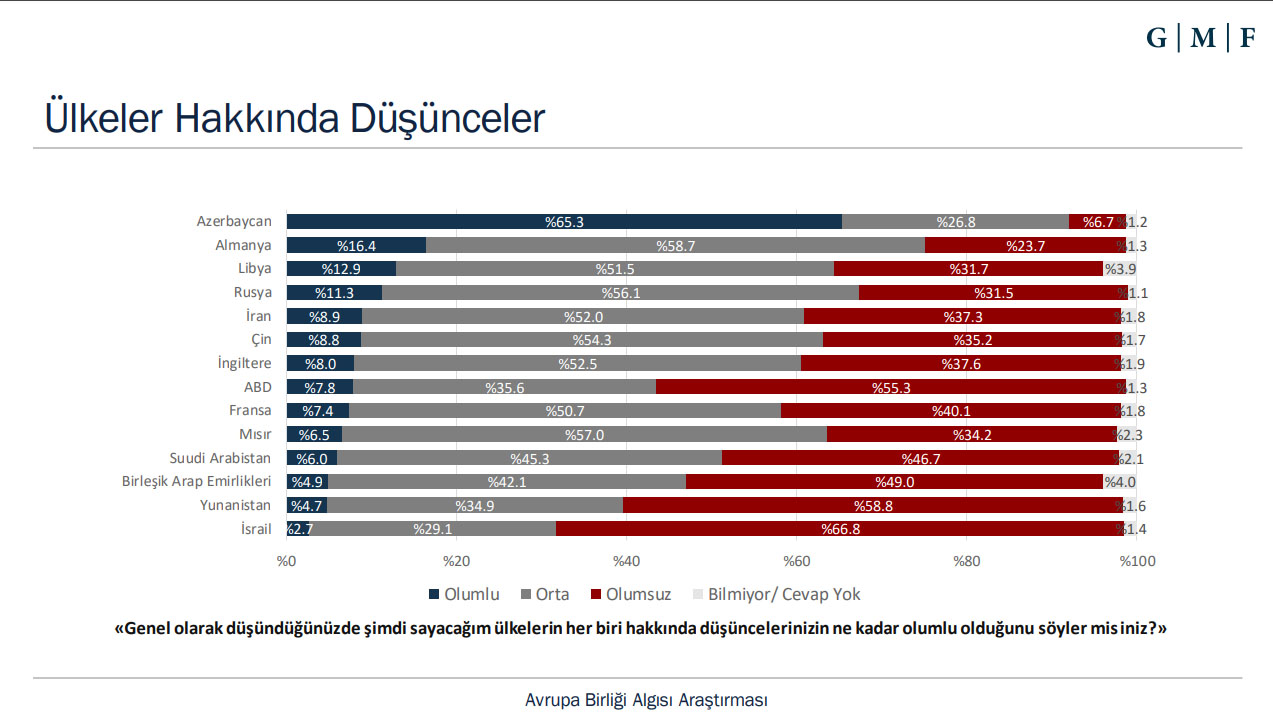 Araştırmaya katılan katılımcıların yüzde 65,3'ü Azerbaycan hakkında olumlu geri dönüşte bulunurken Azerbaycan'ı yüzde 16.4'le Almanya, 12,9'la Libya, 11,3'le Rusya takip etti.