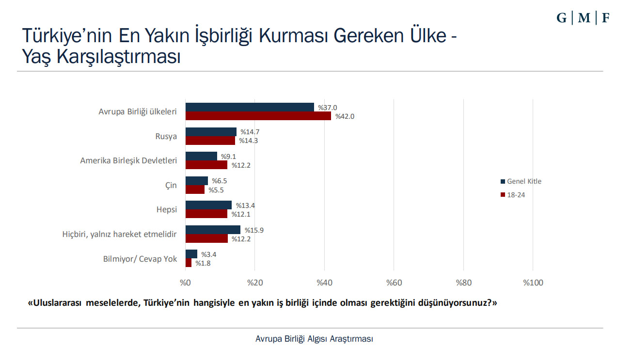 Araştırmaya katılan katılımcıların yüzde 37,0'ı Avrupa Birliği ülkeleri, yüzde 14,7'si Rusya, yüzde 9,1'i ABD, yüzde 6,5'i Çin ile işbiriliği yapılması gerektiğini belirtti. Bu oran 18-24 yaş arası gençlerde AB ülkeleri için yüzde 42,0, Rusya için 14,3 ABD için 12,2, Çin için 5,5 olarak ölçüldü.