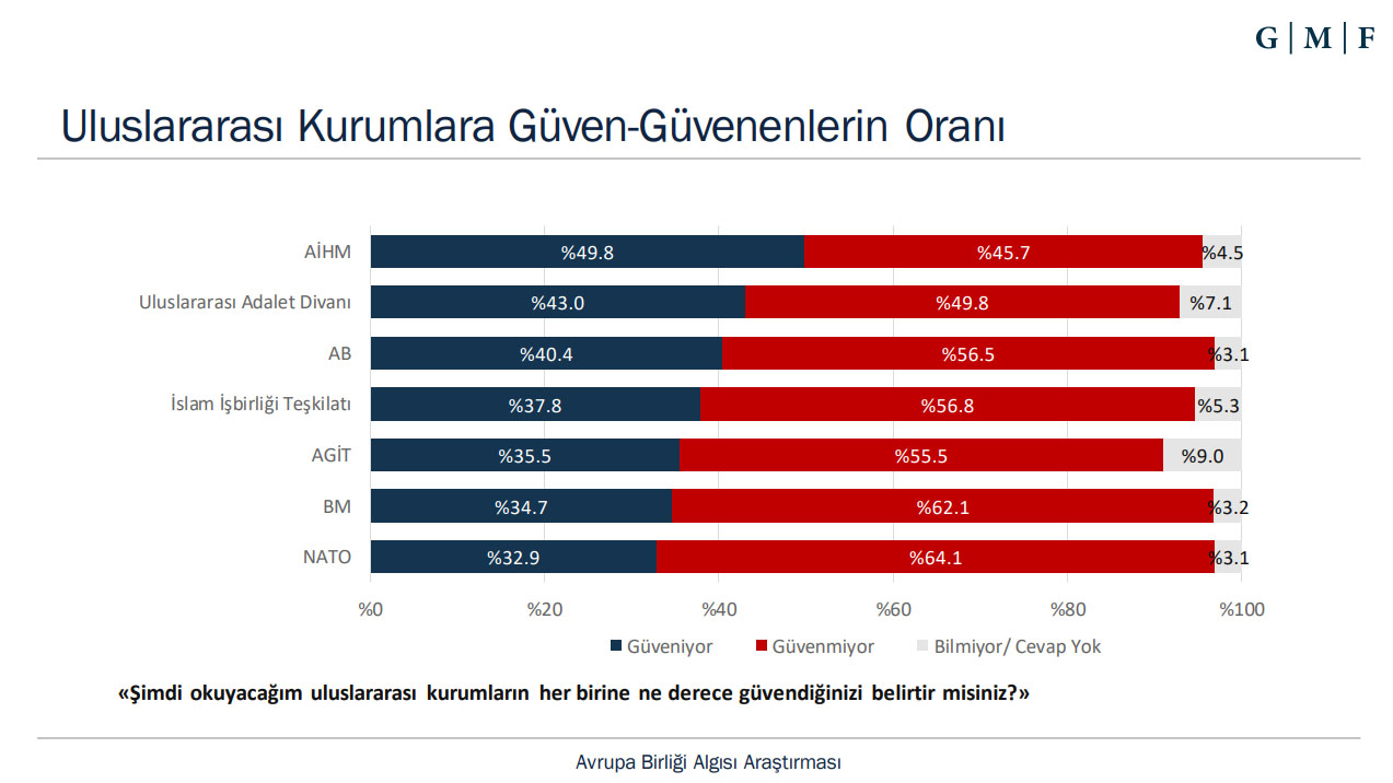 Araştırmaya katılan katılımcıların yüzde 49,8'i AİHM'e güvenirken NATO yüzde 32,9'la güven araştırmasında son sırada yer aldı.