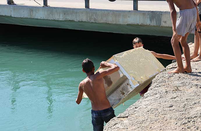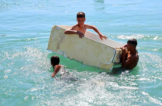 Buzdolabının içerisine yatarak kanalda sürüklenen gençler, "Bizim teknemiz yok ama bu bizim milyonluk yatımız" diyerek serinliyorlar.