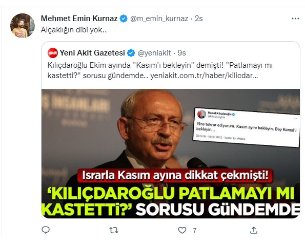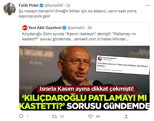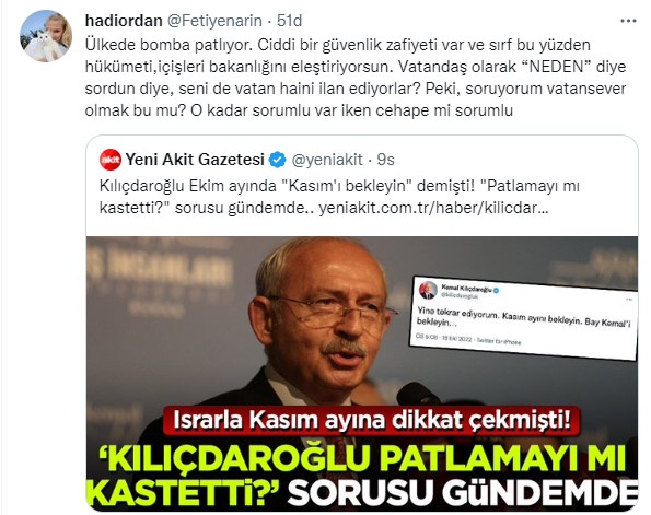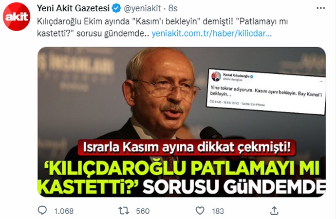 Mustafa Kemal Atatürk hakkında hakaret içerikli yaptığı haberlerle gündeme gelen gerici Akit bu kez Taksim'deki terör saldırısıyla CHP Lideri Kemal Kılıçdaroğlu'nu ilişkilendirdi. Akit Kılıçdaroğlu'nun "Kasımı bekleyin" sözlerini hedef aldı. Gerici Akit, Kılıçdaroğlu'nun sözlerini hatırlatarak, "Sosyal medya kullanıcıları, "Kılıçdaroğlu Taksim’de patlayacak bombayı kastederek mi kasımı bekleyin dedi" " ifadelerini kullandı.