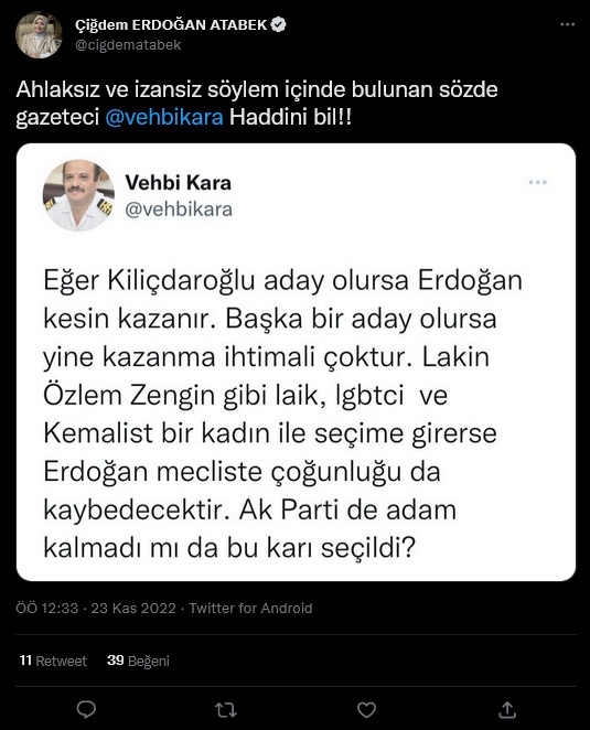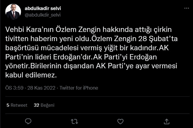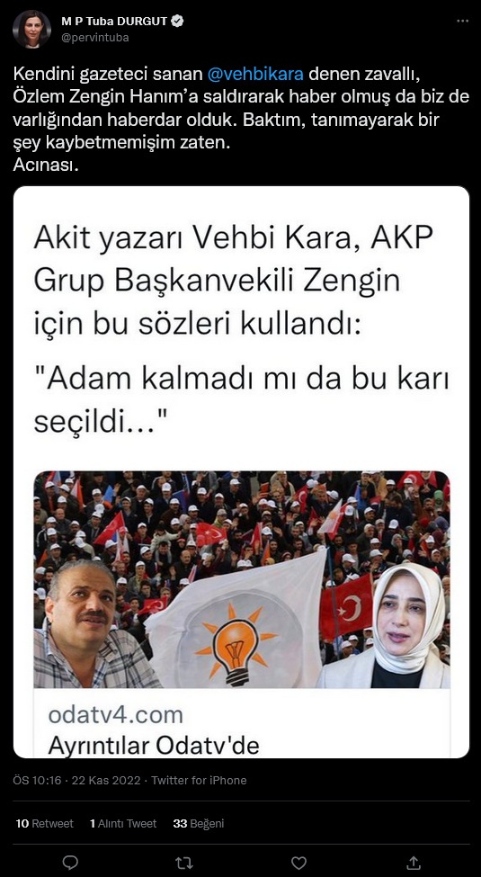 Gerici ve yandaş Akit'in köşe yazarı Vehbi Kara, Twitter hesabından AKP Grup Başkanvekili Özlem Zengin'i hedef aldı.