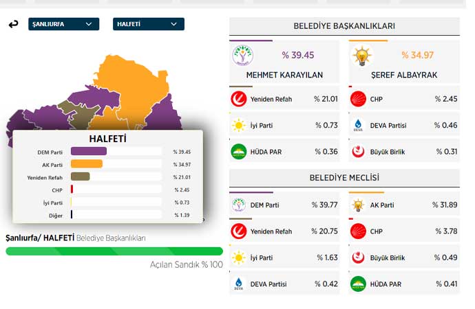 Şanlıurfa’nın Halfeti ilçesinde yerel seçimleri DEM Parti’nin adayı Mehmet Karayılan yüzde 39,45’le kazandı. İlçede AKP’nin seçimlere itiraz etmesinin ardından seçimlerin iptal edilmesine karar verildi.