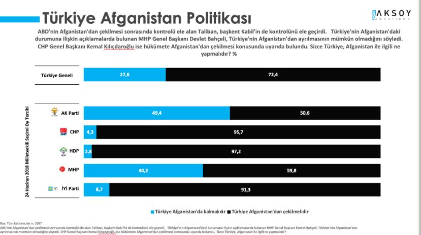 Bahçeli’nin açıklamasına katılan MHP seçmeninin oranı ise yüzde 40,2 seviyesinde kalırken; karşı görüşü savunan MHP seçmeninin oranı yüzde 59,8 oldu. Türkiye’nin Afganistan’da kalması gerektiğine en büyük desteği veren AKP seçmeninde bile bu oran yüzde 50’nin altında kalırken; AKP seçmeninin yüzde 50,6’sı Türkiye’nin Afganistan’dan çekilmesi görüşünü savunmakta.