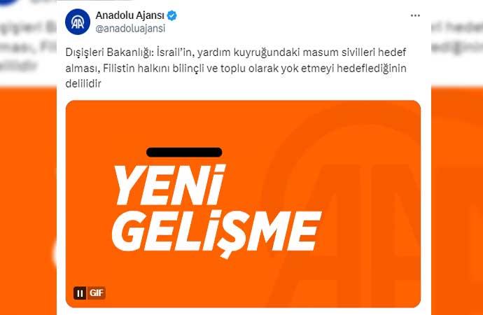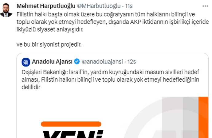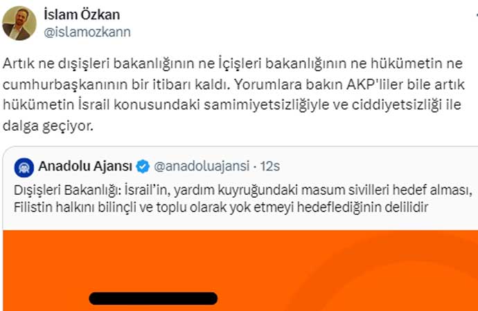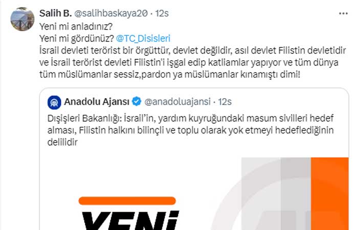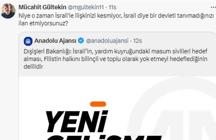 Anadolu Ajansı tarafından Dışişleri Bakanlığı’nın İsrail ile ilgili yaptığı açıklamanın yer verildiği paylaşımda çok sayıda kişi AKP’ye tepki gösterdi. Paylaşımın altına, “Yapmış olmak için açıklama yapıyorsunuz”, “İsrail ile ticareti bitirin”, “Dostlar alışverişte görsün”, “İşbirlikçi AKP” gibi yorumlar yapıldı.