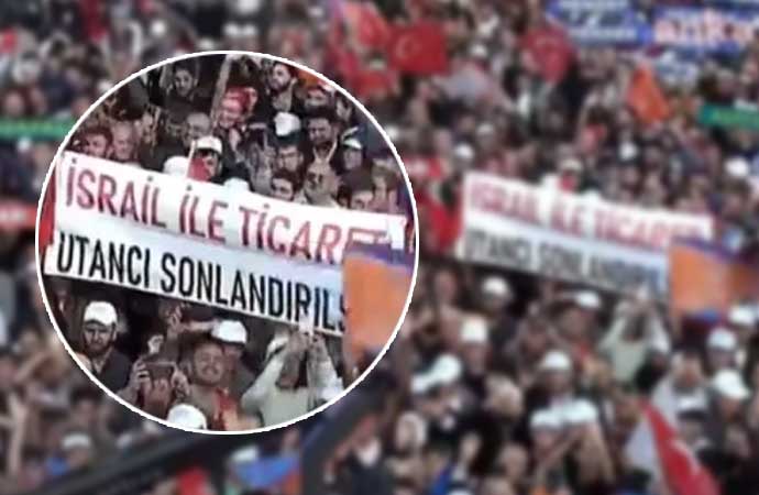AKP’li Cumhurbaşkanı Recep Tayyip Erdoğan’ın Sakarya mitinginde, seçmenler “İsrail ile ticaret utancı sonlandırılsın” pankartı açarken, iktidara bir tepki de sosyal medyadan geldi.