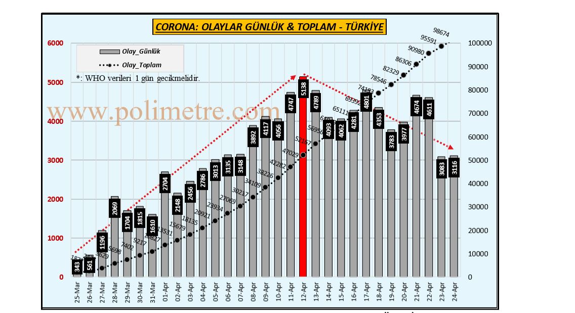 Salgın OLAY ve ÖLÜM bağlamında TEPE noktasını görmüştür, Ancak bu durum 2. bir TEPE olmayacağı anlamına gelmez, OLAYLAR 20 güne sıfırlanacaktır, Takip eden 10-20 gün içinde de ÖLÜMLERİN sıfırlanması beklenebilir OLAYLARIN tepe noktasının, 11-Nisan sokağa çıkma vukuatından önce olması normal değildir, Tıp İnsanları tarafından açıklanması gerekir, Bakanlıkça açıklanan verilerde, doğru veri açıkladığı kabul edilen ülkelere göre önemli farklılıklar vardır, Bu nedenle şu anki durumu DSÖ gibi tedbirli iyimserlikle izlemekteyiz.