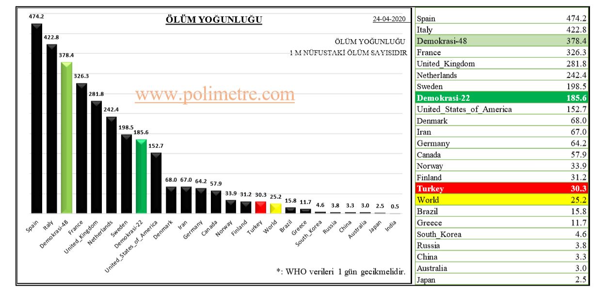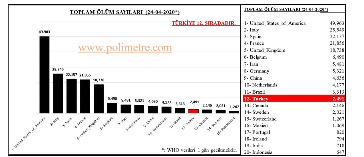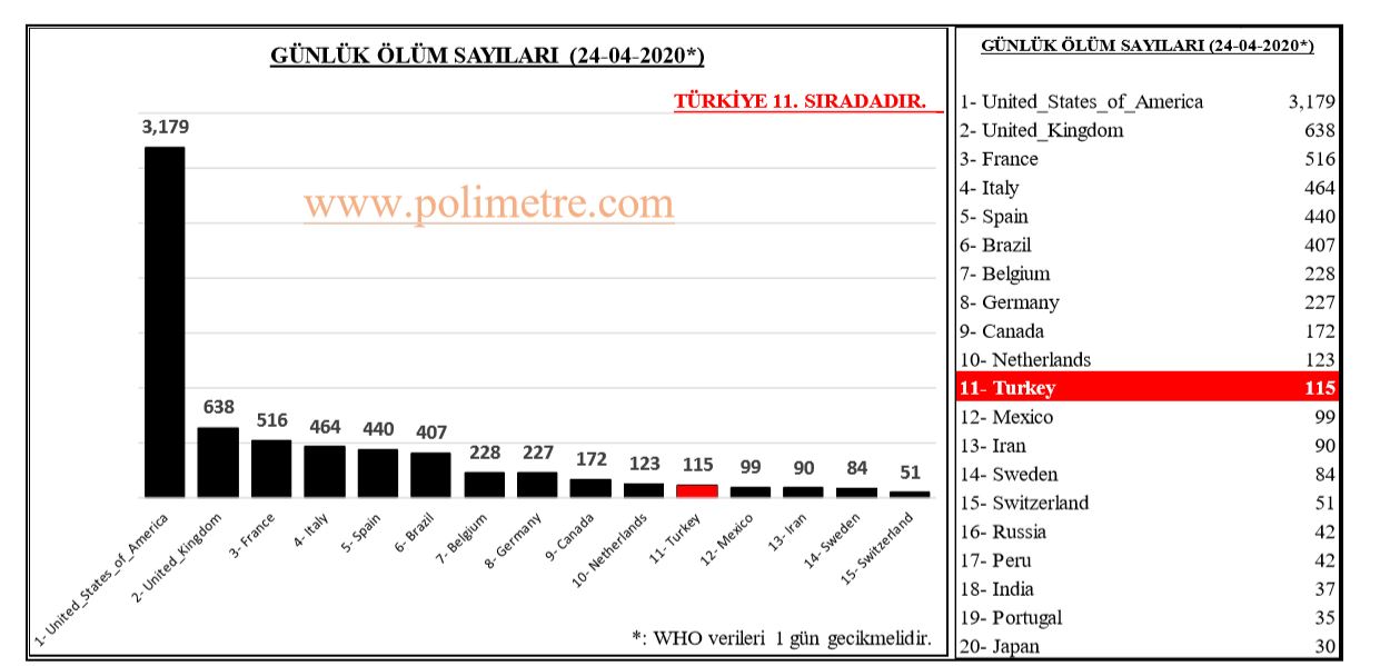 “GÜNLÜK ÖLÜM” sıralamasında 22-Nisan’da, 14. sırada olan TÜRKİYE bugün, 11. sıradadır.