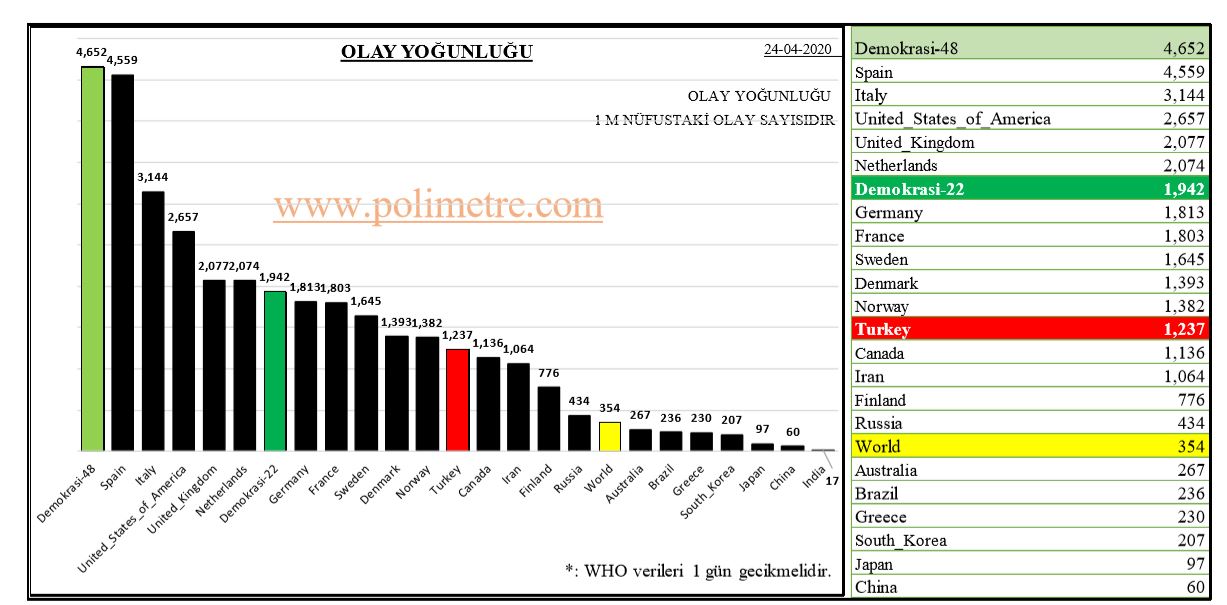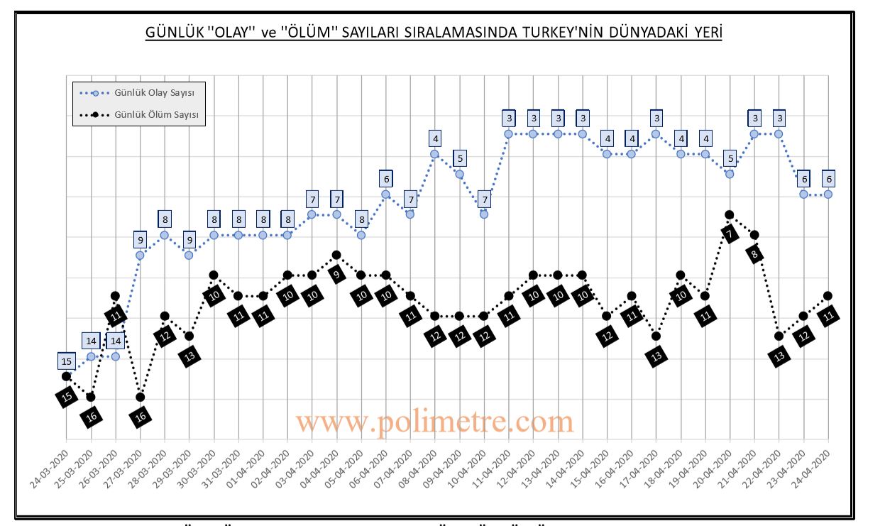 TÜRKİYE, “GÜNLÜK OLAY SAYISI” kriterinde 2 gün öncesine göre 3 sıra geriledi. Bu sevindirici bir gelişmedir. Öte yandan “GÜNLÜK ÖLÜM SAYISI” kriterinde ise beklendiği gibi yükselişe geçti.