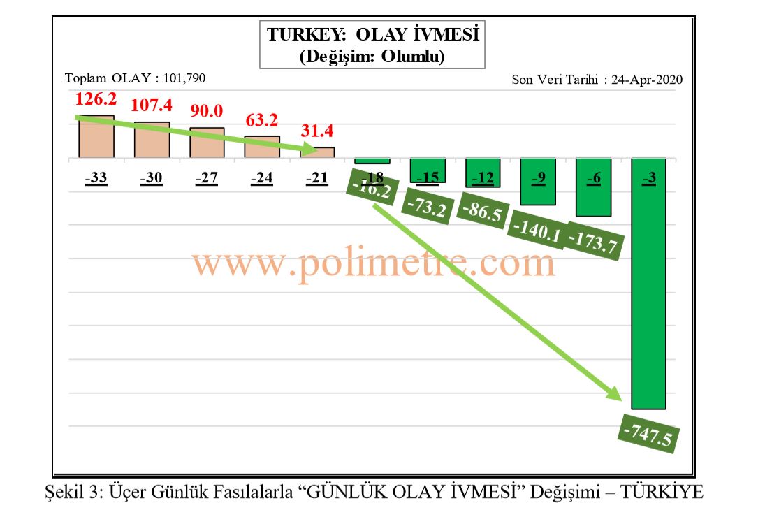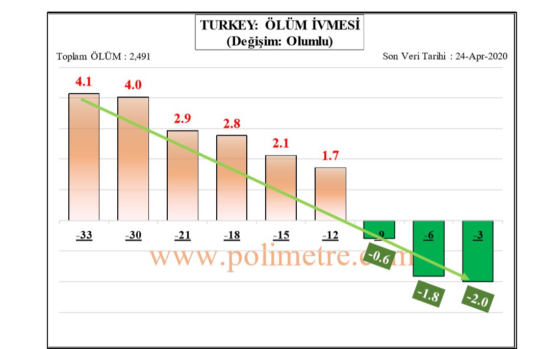 ÖLÜM İVMESİ: Son 3-6-9 günlük ivmelerİ olumludur. İvme eksiye dönmüştür. Bunun anlamı, ivmenin eksi olarak devam etmesi durumunda bir müddet sonra ölümlerin sıfırlanacağıdır.