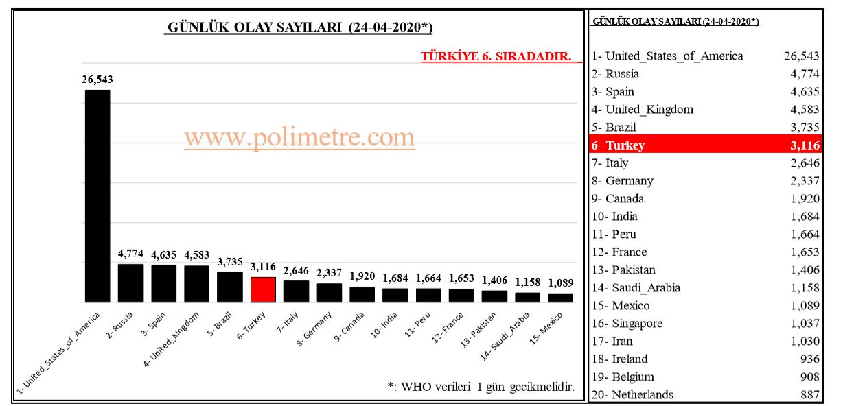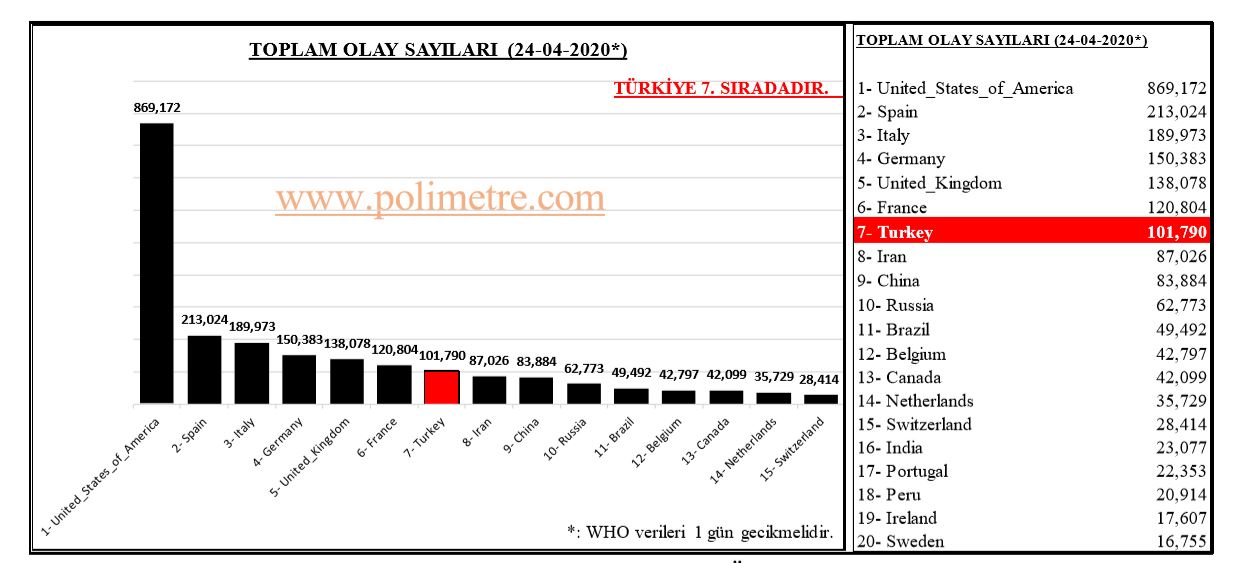 Türkiye’nin TOPLAM OLAY ve TOPLAM ÖLÜM sıralamalarındaki yeri 22-4-2020 tarihine göre değişiklik göstermemiştir.