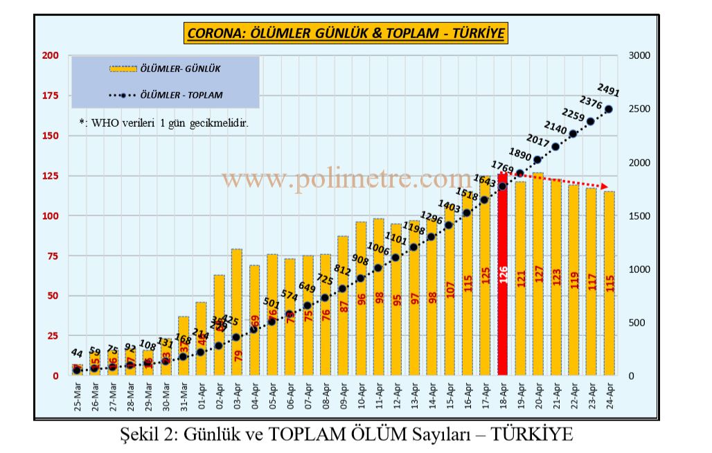 Şekil 1 ve Şekil 2 de Türkiye’deki “GÜNLÜK OLAY” ve “GÜNLÜK ÖLÜM” sayıları, tekil ve yığışımlı olarak gösterilmektedir. Her iki grafikte de doruğa ulaşılan gün kırmızı renk ile işaretlenmiştir. 12-Nisan tarihinden itibaren GÜNLÜK OLAY sayılarında azalma eğilimi görülmektedir. 18-Nisan tarihinden itibaren GÜNLÜK ÖLÜM sayılarında sürekli azalma gözlenmektedir. Sağlık Bakanlığının verileri esas alındığında salgın gerek OLAY SAYISI gerekse de ÖLÜM SAYISI anlamında TEPE noktaya ulaşmıştır. Bu durum 2. bir TEPE olmayacağı anlamına gelmemekle birlikte bugün için ümit veren durumdur.